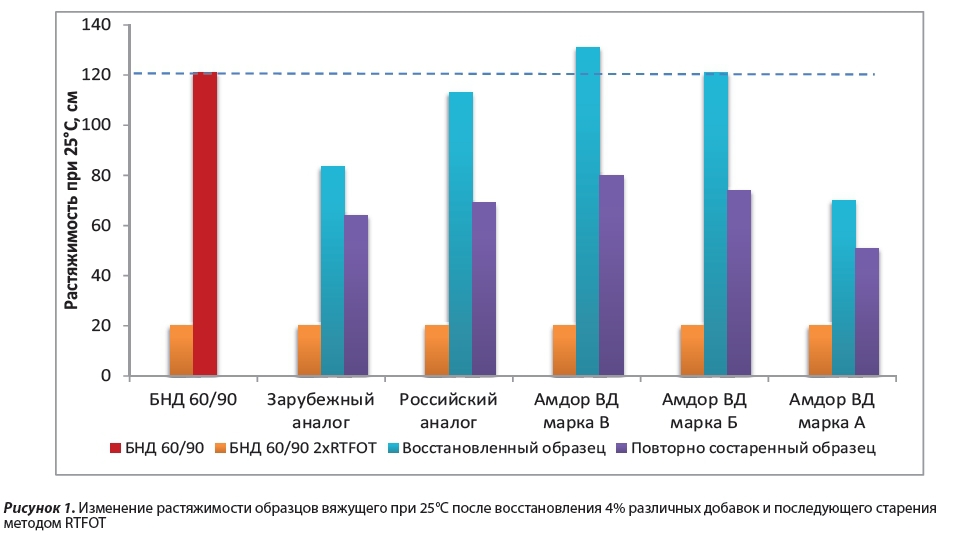На рисунке 1 отражены изменения показателя растяжимости образцов при 25°С после восстановления добавками и после последующего старения этих образцов в сравнении с показателями растяжимости состаренной и исходной проб вяжущего марки БНД 60/90 (первый ряд). Как видно из рисунка 1, добавки АМДОР-ВД марок Б и В обеспечивают эффетивное восстановление и лучшие показатели после повторного старения.