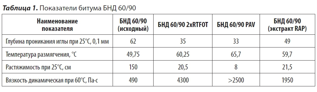 Подразумевается, что последовательное старение методами RTFOT и PAV моделирует реальные процессы и в результате вяжущее будет иметь эксплуатационные показатели, аналогичные экстрагированному из RAP. В таблице 1 представлены физико-механические характеристики битума марки БНД 60/90 до старения, после старения в двух циклах по методу RTFOT, последовательного старения RTFOT и PAV и экстрагированного RAP-вяжущего.