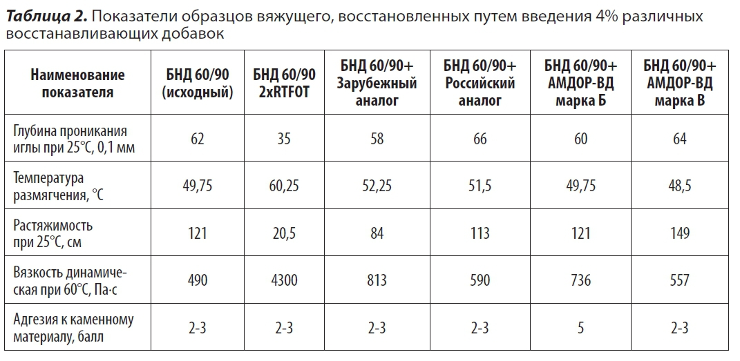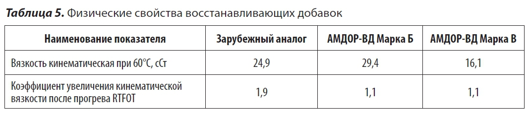 Для определения стабильности образцы восстанавливающих добавок были подвергнуты технологическому старению по методу RTFOT для определения потери массы и изменения вязкости добавки. Результаты испытаний приведены в таблице 5.