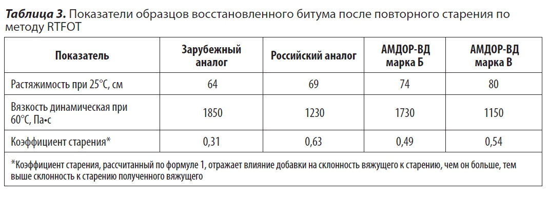 Данные таблицы 3 показывают, что несмотря на неплохие абсолютные показатели, коэффициент старения вяжущего, содержащего образец восстанавливающей добавки российского производства, в 2 раза больше, чем образца с зарубежным аналогом, и в 1,2-1,3 раза больше, чем образцов, восстановленных АМДОР-ВД. Зарубежный аналог, напротив, имеет самую низкую скорость старения, но абсолютные показатели вяжущего с его содержанием и до старения, и после — значительно уступают российским образцам. В обоих случаях придется увеличивать дозировку добавки, чтобы конечная АБС имела оптимальные эксплуатационные свойства.