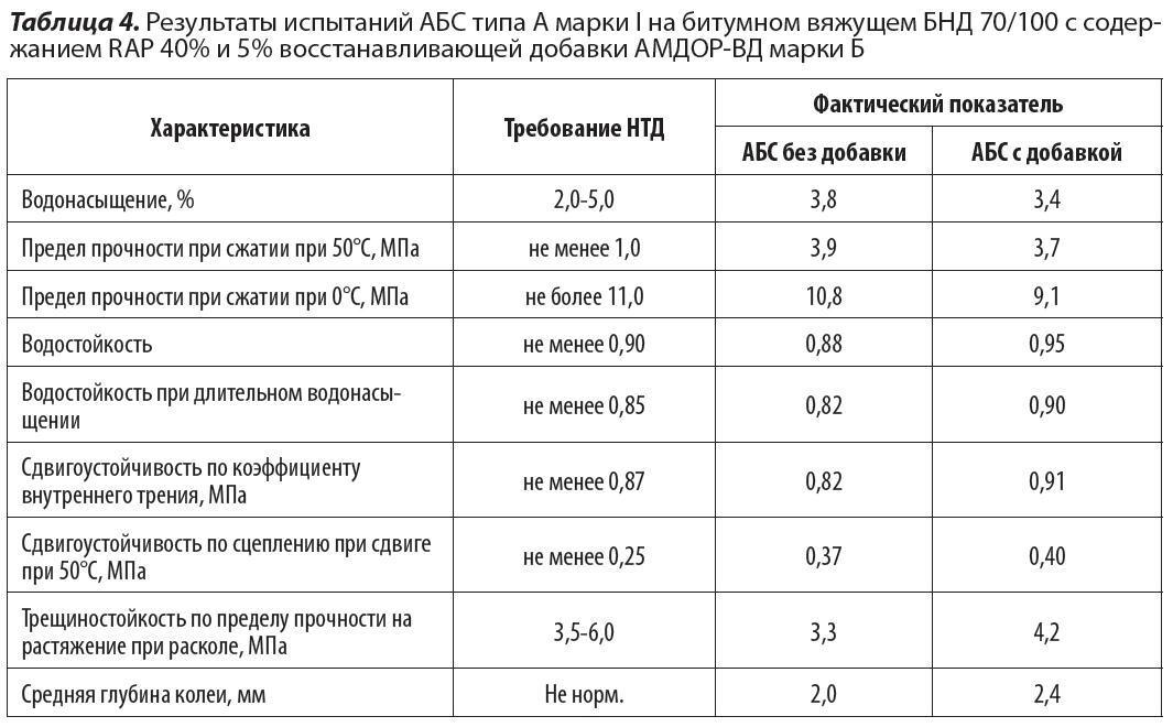Добавка АМДОР-ВД марки Б, как показавшая оптимальный результат (по сумме всех испытаний), далее была использована для приготовления горячих АБС типа А марки I на битумном вяжущем марки БНД 70/100, с содержанием RAP 40%. По результатам испытаний АБС оптимальная дозировка добавки составила 5%. В таблице 4 приведены свойства данной АБС.