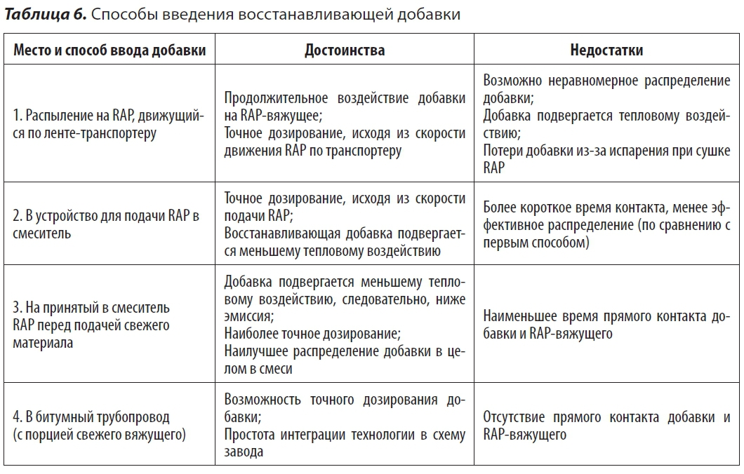 В таблице 6 приведен анализ наиболее предпочтительных способов интеграции узла ввода восстанавливающей добавки в схему существующего асфальтобетонного завода. Ввод добавки может быть организован любым из описанных способов, либо альтернативным путем, предусмотренным технологической схемой АБЗ. Фактически, процессы диффузии добавки в RAP-вяжущее продолжаются и после выхода смеси из асфальтосмесителя, но уже в меньшей степени — вследствие более низких температур и разбавления свежим битумом. Однако, предпочтительно вводить добавку на ранних стадиях технологического процесса, особенно при работе с малым количеством RAP. В таком случае восстановление пройдет наиболее эффективно и результат разбавления свежим вяжущим будет нивелирован. При работе с большим количеством RAP допустимы все описанные варианты работы. Так как количество свежего материала в этом случае меньше, то разбавление добавки происходит в меньшей степени.