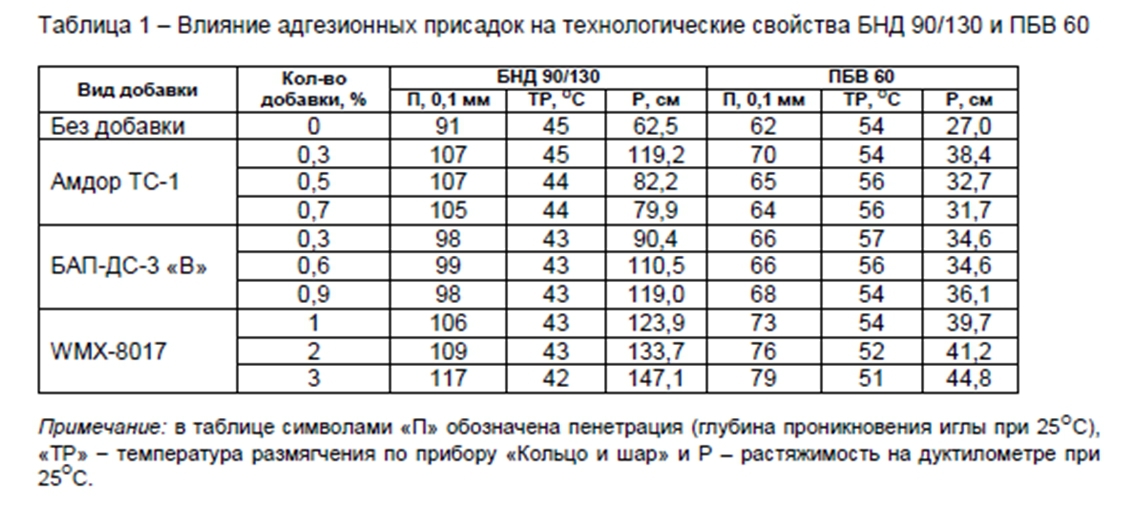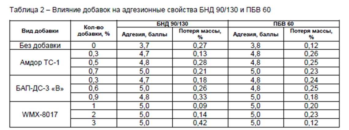 Влияние вышеперечисленных адгезионных присадок нз технологические свойства битумных вяжущих БНД 90/130 и ПБВ 60 представлено в таблице 1, а на адгезионные свойства по ГОСТ 12801-98 методом кипячения в течение 30 минут - в таблице 2.