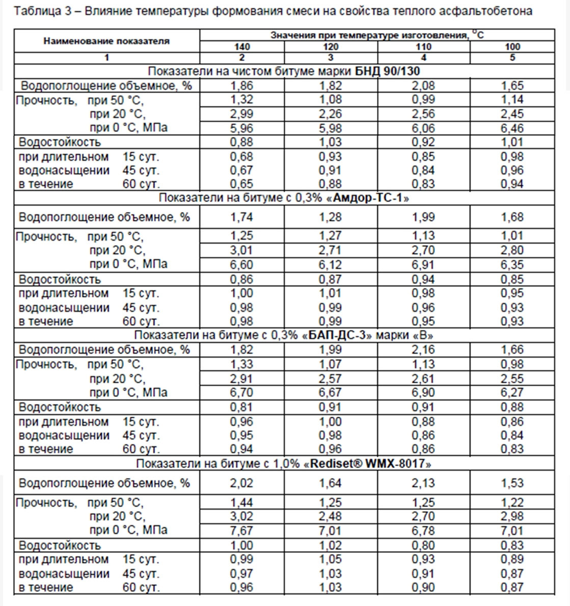 Однако улучшение физико-механических и технологических свойств битумных вяжущих адгезионными добавками не дают гарантии получения качественных теплых смесей. Поэтому результаты прямого эксперимента на горячих мелкозернистых асфальтобетонных смесях типа «Б» марки II представлены в таблице 3.