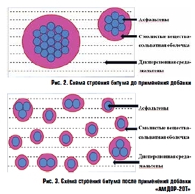Именно с целью улучшения показателей асфальтобетонов в ООО «АМДОР» начато производство адгезионной добавки «АМДОР-20Т». При её разработке максимально были учтены все перечисленные выше требования. «АМДОР-20Т» является кислотно-полимерной добавкой и обладает способностью изменять коллоидную структуру битумов путем разрушения ассоциатов асфальтенов (рис. 2, 3 и 6).