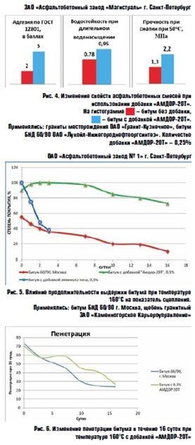 В последнее время адгезионная добавка «АМДОР-20Т» прошла всесторонние испытания в различных крупных дорожно-строительных организациях. На рис. 4-6 представлены некоторые результаты испытаний битумов и АБС при использовании добавки «АМДОР-20Т».