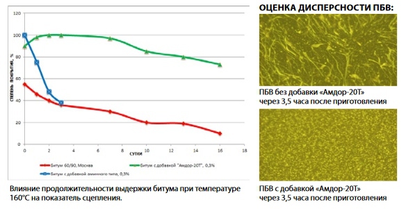- сохраняет эффективность модифицирующего действия на адгезионные свойства полимерно-битумного вяжущего после длительного пребывания последнего в зоне воздействия высокой технологической температуры.